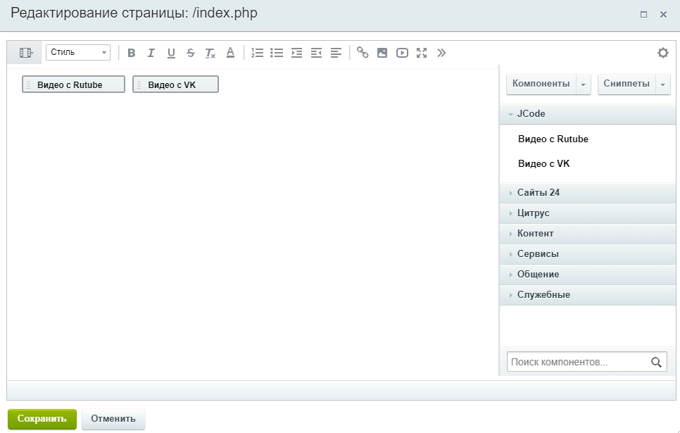 При редактировании страницы на вкладке Компоненты появится раздел JCode, в нем будут отображаться компоненты"Видео с Rutube" и "Видео с VK".