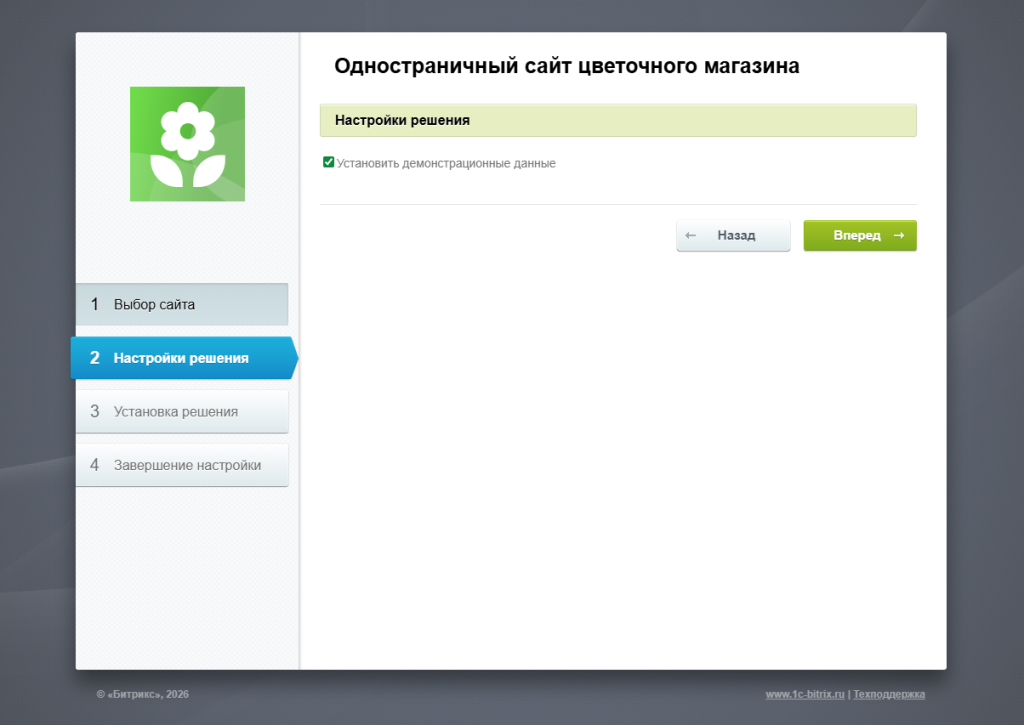 2. Если установить чекбокс, то мастер перепишет индексную страницу вашего сайта, и наполнит её контентом. Если не установлено, то установятся только инфоблоки и настройки в базу данных.