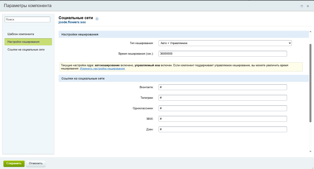 Для каждой сети можно указать свою ссылку. Если поле пустое, то не будет выводиться иконка.