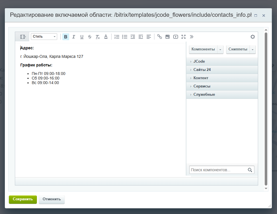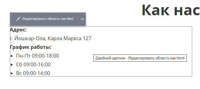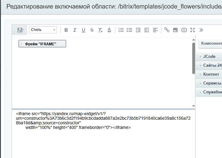 Для простоты, мы сделали карту тоже через включаемую область. Здесь просто добавлен iframe код из конструктора Яндекс Карт. Это очень удобно.