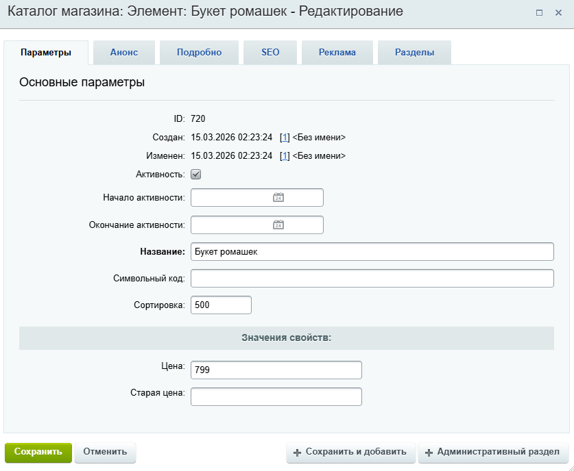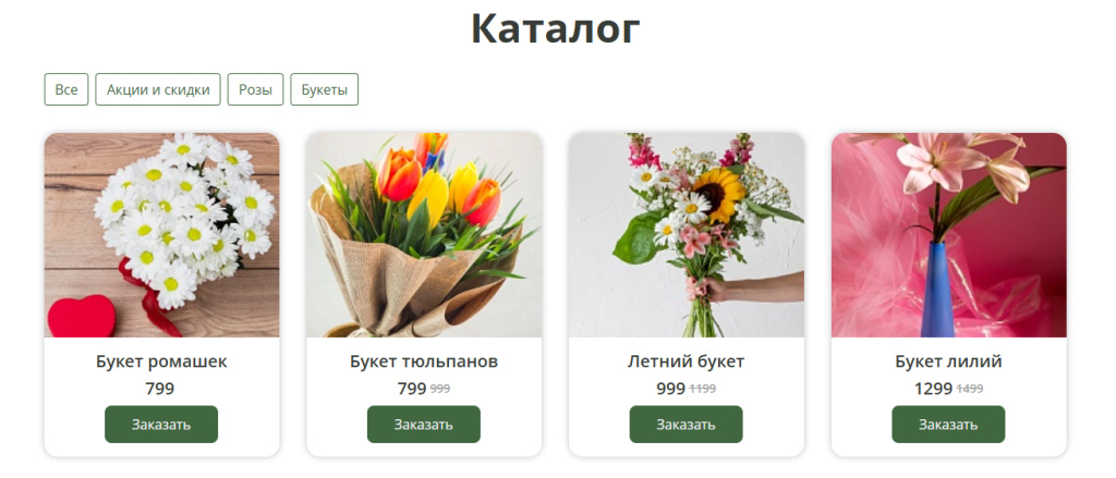 Здесь есть разделение на разделы: например, "Букеты роз", "Акции", "Весенние цветы" и так далее.