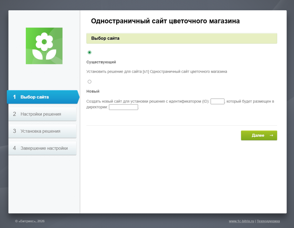 1. Шаг выбора сайта. Здесь необходимо выбрать куда установить. В существующий или новый.