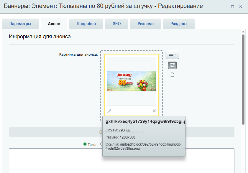 Редактируется в элементе инфоблока. Может быть хоть сколько элементов.Название обязательно для заполнения, оно будет задавать ALT атрибут у картинки. Например, можно указать название акции или просто 1, 2, 3 и так далее.